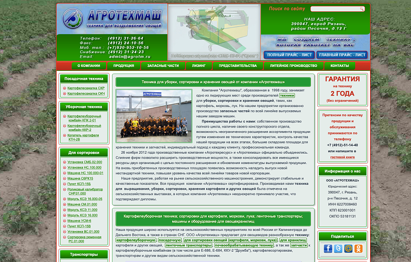 Компания "Агротехмаш", образованная в 1998 году, занимает одно из лидирующих мест среди производителей техники для уборки, сортировки и хранения овощей, таких, как картофель, морковь, лук. На нашем предприятии организованно производство запасных частей по всей линейке выпускаемых нашим заводом машин.
